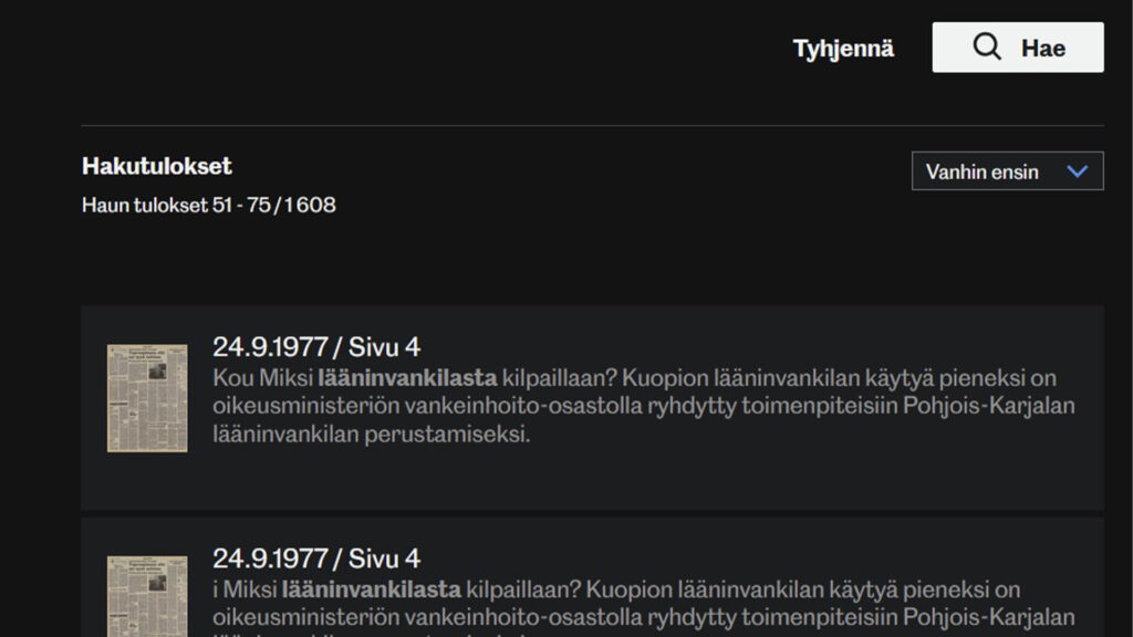 Emme elä täydellisessä tutkimusmaailmassa, jossa kaikki sanomalehtiaineistot ovat saatavilla digitaalisesti. Tämän vuoksi tutkijan on tiedostettava aineiston rajoitukset. Omasta mielestäni sanomalehtiaineistoa pystyy hyödyntämään tehokkaasti vain, jos se on digitalisoitu ja vapaasti saatavilla. Tämä itsessään luo tutkimuksellisia rajoitteita, mistä mainitsin aikaisemmin oman esimerkkini kautta.(Kurvinen 2023.) Tällä hetkellä kaikki vuoteen 1954 asti julkaistut sanomalehdet ovat digitoituina Kansalliskirjaston digitaaliset aineistot -palvelussa. Tämä tarkoittaa, että jos haluaa tutkia vaikka 1970-luvun oikeushistoriaa sanomalehtien avulla, joutuu aineiston läpikäymään mikrofilmeiltä, mikä on huomattavan hidasta työtä. Tutkijat ovatkin nostaneet esille aineiston digitalisoimisen hitauden (Kaleva 2025). Myönnän suoraan, että en olisi voinut tehdä tätä oikeushistoriallista tutkimusta, jos Karjalainen ei olisi digitoinut koko sanomalehtiaineistoaan. Kyseinen aineisto ei kuitenkaan ole kaikille vapaasti saatavilla, vaan jouduin omasta kukkaroistani maksamaan Karjalaisen kuukausitilauksen, jotta pääsin hyödyntämään Karjalaisen Kaiku-arkistoa.